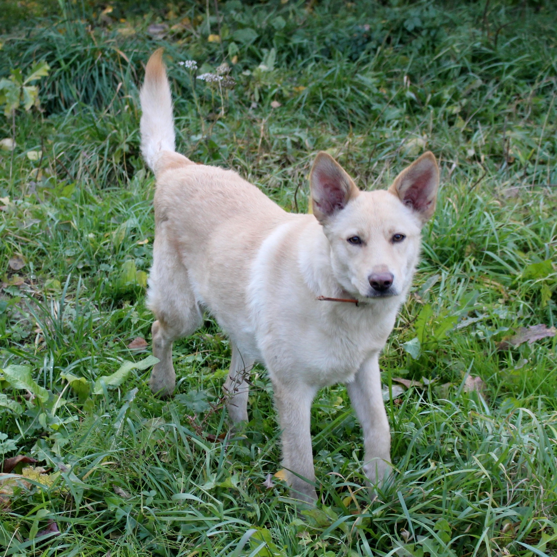Спокойная, но острожная собачка . Надо приручать . Приучать к поводку . Ей нужно время на доверие.